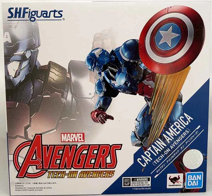 Description: Captain America from “Tech-On Avengers” joins S.H.Figuarts! Entirely re-envisioned by artist Eiichi Shimizu, this Captain America features a metallic finish and a frame incorporating diecast metal parts. Packed with effects and accessories, it also lets you replicate the Tech-On Avengers’ trademark DH-10 Mode. [Set Contents] Main Body, Four pairs of optional hands, DH-10 Armor, Shield (normal), Shield (DH-10), Shield effect parts, Chest effect parts, Optional sleeves, Shield joint set, Shield throwing effect , Fist effect parts, Repulsor effects (feet) (x2), Repulsor effects (hands) (x2), Stand.