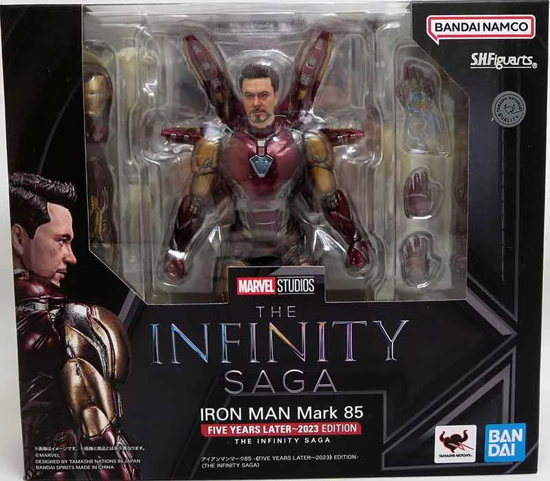 Description: Five years have passed since the release of Avengers: Infinity War. Tamashii Nations is excited to release a new recolor of Iron Man Mark 85, designed to even better capture his on-screen appearance and with new bonus parts! Combine it with the new release of Thanos (sold separately) to re-create the epic climax of Avengers: Infinity War! Includes: Optional head, Four pairs of optional hands, Repulsor effect set, Nano lightning refocuser, Lightning refocuser effect part set, Claw blasters (L/R), and Finger snap part set. .