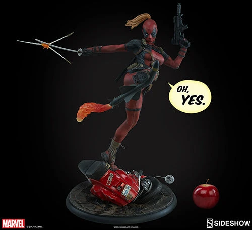 Description: The Lady Deadpool Premium Format Figure stands 22� tall on top of a damaged red scooter base, decorated with fun stickers that hold fourth wall-breaking references. She kicks into action with her signature blonde ponytail waving in the wind, posed precariously while redirecting a missile in midair and simultaneously slicing a bullet in half with her katana. Lady Deadpool is raising a gun to the air as she makes her dynamic attack. With a swap-out accessory, see her launch the infamous Headpool into the air, armed to the teeth with explosive dynamite.