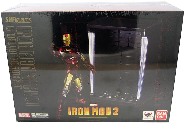 Description: From Tamashii. Recreate Tony Stark’s lab with the S.H.Figuarts Iron Man Mark VI and Hall of Armor Set! The S.H.Figuarts Hall of Armor project begins with the return of the iconic Mark VI suit from Iron Man revamped with a completely refined sculpt. The spectacular Hall of Armor includes LED light-up features in the front, back and sides to illuminate your armor collection. Not only that, multiple hall of armor pieces can be connected, taking your collection even further! Set includes interchangeable hand parts, interchangeable shoulder part set, interchangeable leg armor set, effect parts set, and Hall of Armor attachment parts. Iron Man stands approximately 8′ tall.