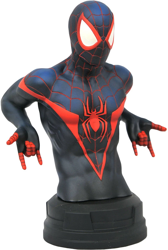 Description: A Diamond Select Toys release! Preparing to fire double web lines and launch himself into the fray, this 1/7 scale resin bust of Miles Morales is ready for action! Measuring approximately 6 inches tall, it features detailed sculpting and paint applications and is limited to only 3,000 pieces. It comes packaged in a full-color box with a certificate of authenticity. Sculpted by Joe Menna.