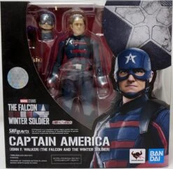 Description: From the series , The Falcon and the Winter Soldier, the second Captain America, John F.Walker, joins S.H.Figuarts! Includes his trademark shield and effect parts for replicating shield-throwing scenes. Also includes an optional head without a helmet. [Set Contents]Main Body, Three pairs of optional hands, Optional head without a helmet, Gun, Holster (empty), Shield, Shield strap parts, Effect parts.