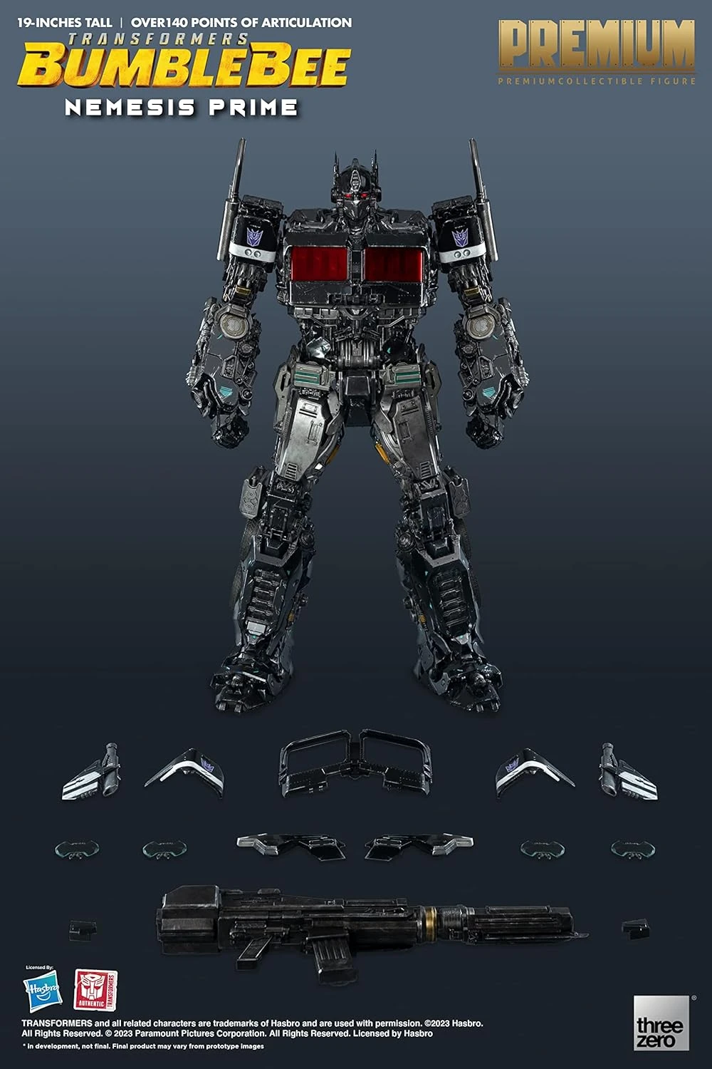 Description: Threezero is proud to present Nemesis Prime as the next character in the Transformers PREMIUM Collectible Figure Series! The evil doppelganger Nemesis Prime, the dark mirror of Optimus Prime, is ready to dominate your collection. Standing an impressive 19 inches tall, the Transformers: Bumblebee PREMIUM Nemesis Prime collectible figure features over 140 points of articulation including individually articulated fingers. Additional components include LED illuminated eyes, and interchangeable armor pieces that provide the option of displaying the figure as either Earth Mode or Cybertron Mode! Nemesis Prime comes equipped with an LED illuminated Ion Blaster and features a Die-cast Metal Frame, adding an incredible weight and satisfying tactile finish to its dynamic presence! This color variant is a special edition PREVIEWS Exclusive collectible item, and this version of the character did not appear in the Transformers: Bumblebee movie. Requires AG13 x4 Batteries (Batteries Not Included)..